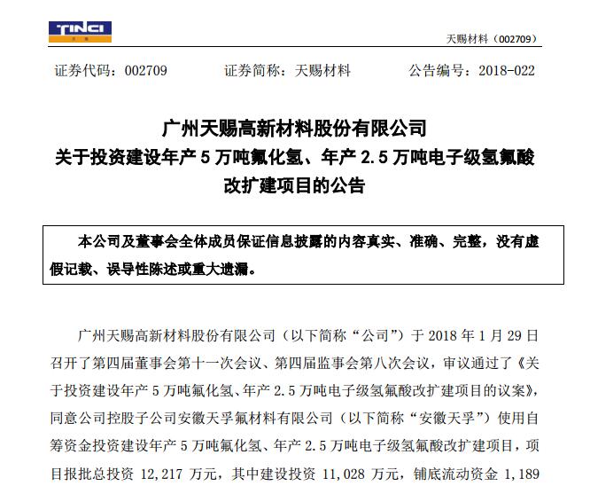 天赐材料(002709.SZ)1月30日晚间发布公告表示,已审议通过公司控股子公司安徽天孚使用自筹资金投资建设年产5万吨氟化氢、年产2.5万吨电子级氢氟酸改扩建项目,项目报批总投资12,217万元,其中建设投资11,028万元,铺底流动资金1,189万元。