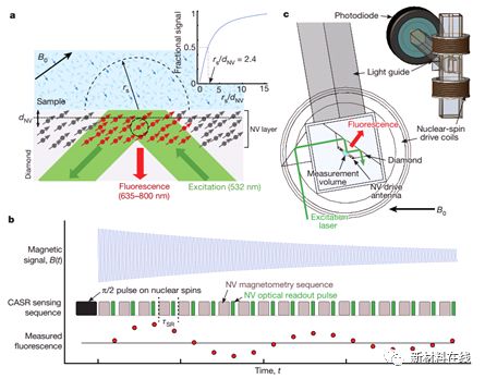 由固态电子自旋组成的量子系统可以作为核磁共振(NMR)信号的灵敏检测器,特别是来自非常小的样品的信号。例如,金刚石中的氮空位中心已经用来记录来自纳米尺度样品的 NMR 信号,其灵敏度足以检测单个蛋白质产生的磁场。但是,报道的利用氮空位中心的分子最佳 NMR 谱分辨率约为 100 赫兹。这不足以解析化学、结构生物学以及材料研究中对于核磁共振应用至关重要的分子结构关键波谱标识,如标量耦合(要求分辨率小于 10 赫兹)和小化学位移(要求分辨率约为原子核拉莫尔频率的百万分之一)。传统感应检测的核磁共振可以提供必要的高波谱分辨率,但因其灵敏度有限而通常需要毫米级的样品(排除对于更小的样品的应用,例如皮升(picolitre-volume)化学分析或相关光学和 NMR 显微镜)。Glenn 等人演示了一种测量技术,该技术使用由氮空位中心组合与窄带同步读出协议共同组成的固态自旋传感器(磁力计),从而得到约 1 赫兹的 NMR 光谱分辨率。利用这种技术来观察大约 10 皮升的微米尺度样品体积中的 NMR 标量耦合。他们还利用与氮空位中心的结合将 NMR 应用于热极化核自旋以及解析小分子的化学位移谱。这一技术能够在单细胞的尺度上实现分析型核磁共振光谱学。(Nature DOI: 10.1038/nature25781)
