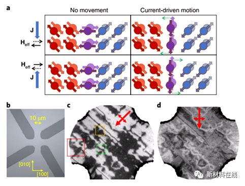 作为自旋电子器件中的有源元件,反铁磁体具有多种良好的性质,包括超快动力学,零杂散场和对外部磁场不敏感性。四方 CuMnAs 是一种测试平台系统,其反铁磁有序参数在环境条件下可以通过电流进行可逆地转变。在以往的实验中,都是利用正交面内电流脉冲诱导来实现反铁磁畴的 90°旋转,以及演示多端几何的全电存储器的位操作。Wadley 等人证明了可以仅使用两个电触点来操纵反铁磁畴壁,实现稳定且可再现的畴变化。该过程是利用电流的极性来转变反铁磁亚晶格上的电流感应有效场的符号来实现。利用 X 射线磁性线性二色显微镜可以对产生的可逆畴和畴壁重构进行成像,也可以利用电信号进行检测。通过畴壁运动产生的转变可以发生在比相干畴转变所需电流密度低得多的情况下。(Nature Nanotechnology DOI: 10.1038/s41565-018-0079-1)
