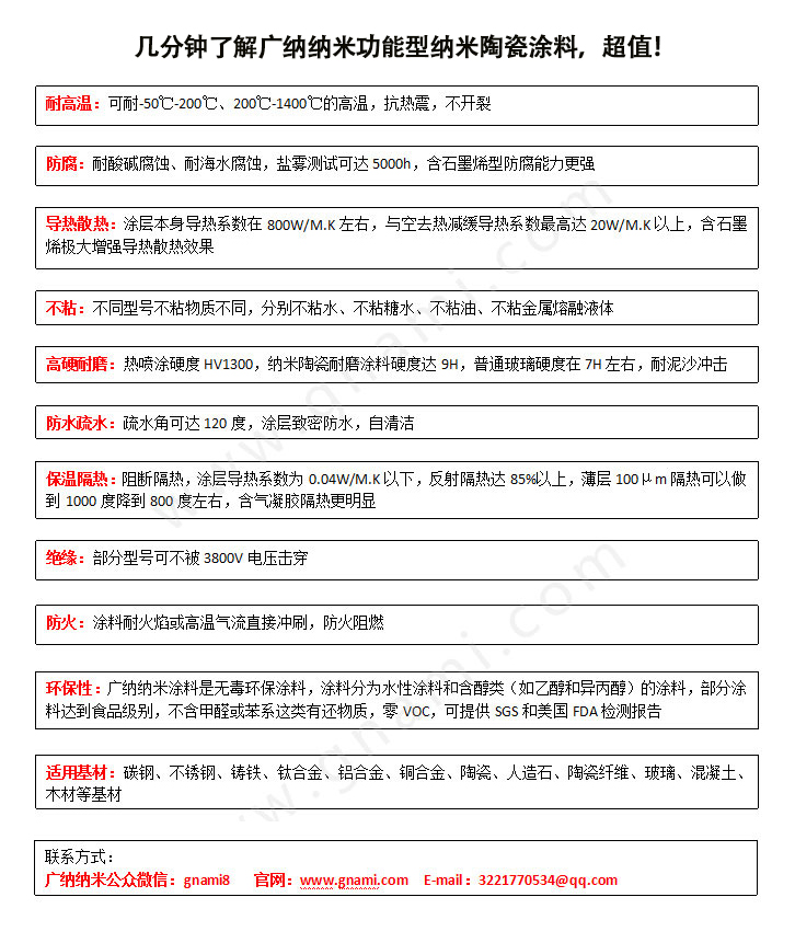 广纳纳米主要研发生产的是纳米复合陶瓷涂料,原料上与传统涂料使用的原材料是有一定差异,如广纳纳米的涂料耐高温高达1300℃,因而是不含树脂的,即使是耐温200度以下的疏水防水,高硬耐磨,隔热防腐涂料,也是不含树脂。当然,原材料价格上涨压力是每个涂料企业都在面临的问题,虽然广纳纳米的涂料不含树脂,然而纳米陶瓷涂料中的原料皆是采用品质优良的原材料,成本本身也是会比传统涂料要高,效果也是比较稳定的。