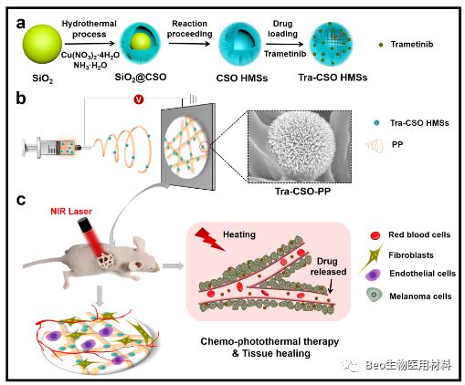 图 1. 复合支架的制备和应用。a,以 SiO2 微球为牺牲模板,采用水热法合成出硅酸铜空心微球,并将化疗药物装载其中;b,利用静电纺丝技术,将载药硅酸铜空心微球纺入聚合物纤维中,制备出复合支架;c,复合支架用于黑色素瘤治疗与创伤修复。