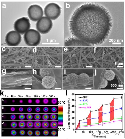 图 2. 复合支架的表征。a-b,硅酸铜空心微球的透射电镜照片、复合支架的扫描电镜照片;硅酸铜空心微球含量为 0%(c、g)、10%(d、h)、30%(e、i);载药硅酸铜空心微球含量为 30%(f、j);k,复合支架在近红外光照射下的热成像照片(硅酸铜空心微球含量 A:0%、B:10%、C:20%、D:30%,载药硅酸铜空心微球含量 E:30%)。右下,复合支架在近红外光照射下升温到 37、43 和 50℃时的药物释放曲线。