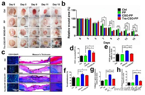 图 3. 体内慢性创面修复效果。a,第 0、5、9、11 和 15 天的慢性皮肤创口照片;b,15 天内创口愈合速度;c,免疫荧光及马森三色组织切片染色照片;d-h,分别为 CD31、血管内皮细胞生长因子、再上皮化、Ⅰ型胶原和Ⅲ型胶原蛋白的数量统计结果。