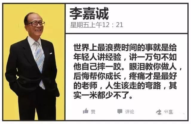 李嘉诚说:“世界上最浪费时间的事就是给年轻人讲经验,讲一万句不如他自己摔一跤。”