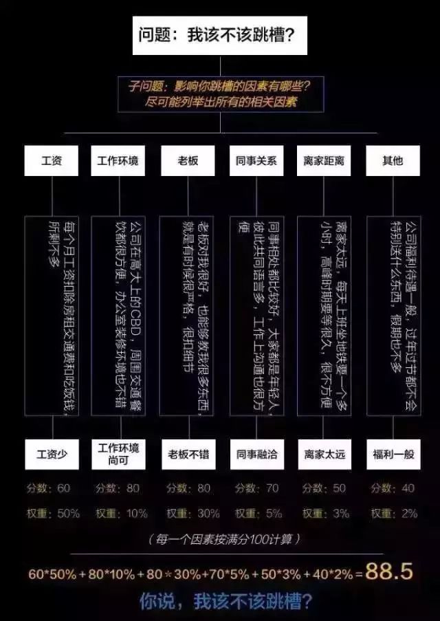 举个例子,比如你现在遇到的问题是:“我该不该现在跳槽?” 那么对这个问题的分解可以如下图所示: