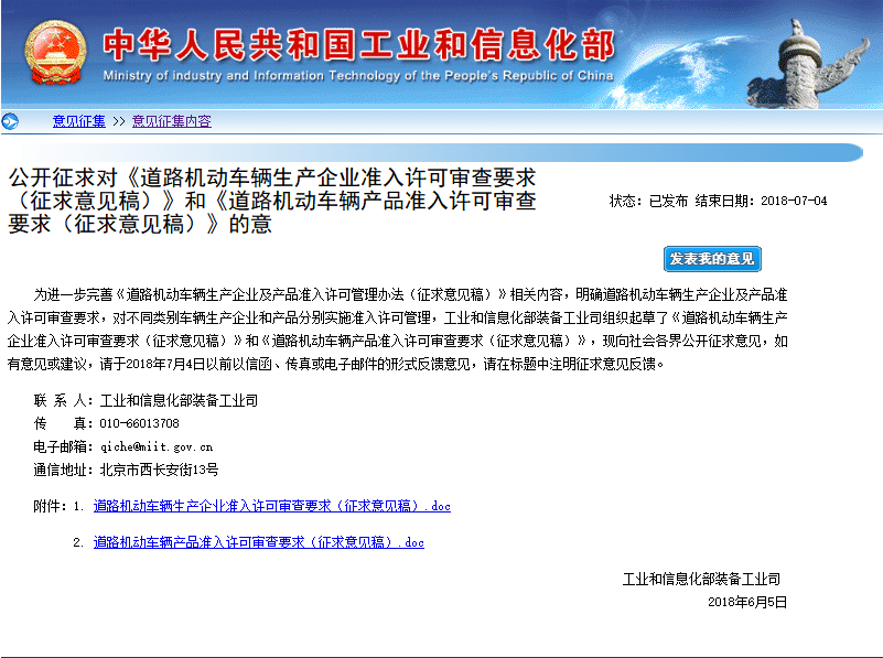 为进一步完善《道路机动车辆生产企业及产品准入许可管理办法(征求意见稿)》相关内容,明确道路机动车辆生产企业及产品准入许可审查要求,对不同类别车辆生产企业和产品分别实施准入许可管理,工业和信息化部装备工业司组织起草了《道路机动车辆生产企业准入许可审查要求(征求意见稿)》和《道路机动车辆产品准入许可审查要求(征求意见稿)》,现向社会各界公开征求意见,如有意见或建议,请于2018年7月4日以前以信函、传真或电子邮件的形式反馈意见,请在标题中注明征求意见反馈。