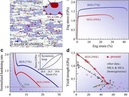 在美国约翰霍普金斯大学马恩教授的协助下,中国科学院吴晓蕾研究小组取得了一系列研究成果。近日,就在美国国家科学院院刊上发表了一项关于“增强多级多相晶粒结构(HGS)策略”的研究动态 。他们使用面心立方CrCoNi中熵合金(MEA)作为研究对象,演示了这种HGS策略。