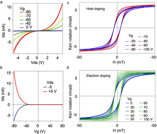 团队采用惰性气氛下原子层厚度的垂直组装,将3.5nm厚Cr2Ge2Te6少数层材料封装于两层氮化硼之中,解决了母材料空气中稳定性欠佳的问题。通过微纳米加工手段制备得到场效应器件,并进行系统的低温电学与磁学测量。电输运测量表明,少数层Cr2Ge2Te6在铁磁居里温度(~65K)以下,保持了载流子导通性,并且能够实现电子与空穴的双极场效应。室温下施加1V源漏电压,可得到数十微安的开态电流,开关比达到104以上。居里温度以下的低温微区磁光Kerr测量表明,该型纳米器件在门电压调控下,磁性亦能得到有效调控,并且与电输运相仿,存在双极门电压可调特性。证实了基于二维范德华铁磁半导体的自旋场效应器件的可行性。