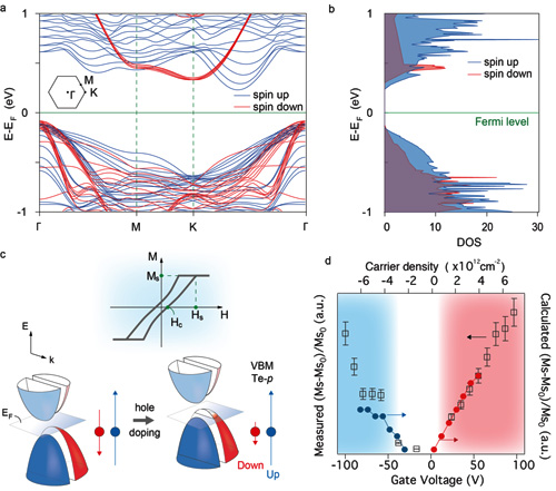 金属所杨腾副研究员对本体系做了系统的第一性原理计算和微磁学模拟,计算模拟结果与实验结果十分吻合。模拟表明,该体系中存在特殊的自旋极化的能带,间接带隙的上下带边分别由Cr-d贡献的自旋多子态和Te-p贡献的自旋少子态,造就了实验上观测到的自旋与电荷的双重双极场效应。