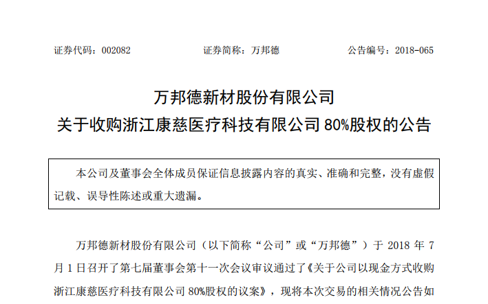 7月2日,万邦德(002082.SZ)发布公告表示,公司拟以自有资金向周建明购买康慈医疗80%股权,本次收购交易价格为19,800.00万元,本次收购完成后,康慈医疗将成为公司的控股子公司。