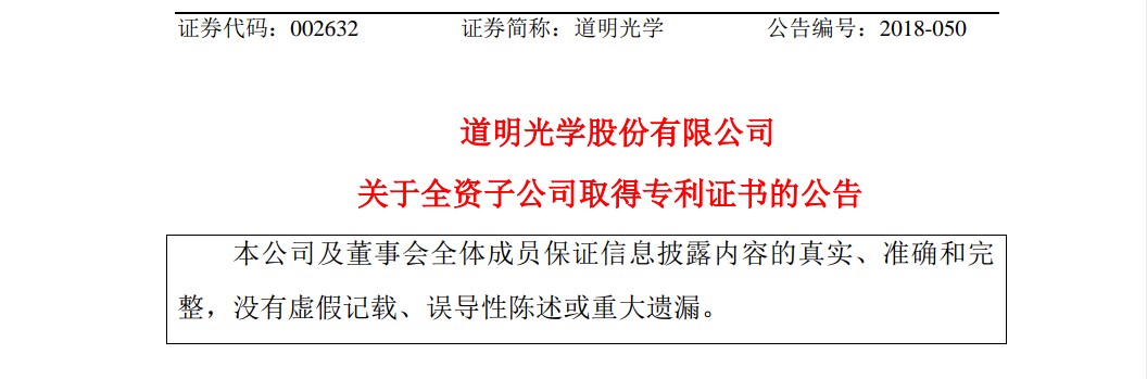 道明光学表示,上述专利证书的取得对公司发挥自主知识产权优势,形成持续创新机制,保持技术的领先,提升公司的核心竞争力有积极意义。