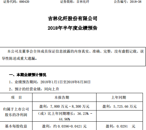 7月5日,吉林化纤(000420.SZ)发布《2018年半年度业绩预告 》,公司预计上半年实现归属于上市公司股东的净利润7,800 万元–8,300 万元,(或)比上年同期增长36.23% -44.96%。