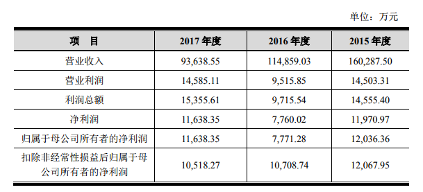芯能科技招股说明书显示,公司2015、2016、2017年分别实现营业收入16.03亿元、11.49亿元、9.36亿元;实现归属于母公司所有者的净利润1.20亿元、0.78亿元、1.16亿元。具体如下: