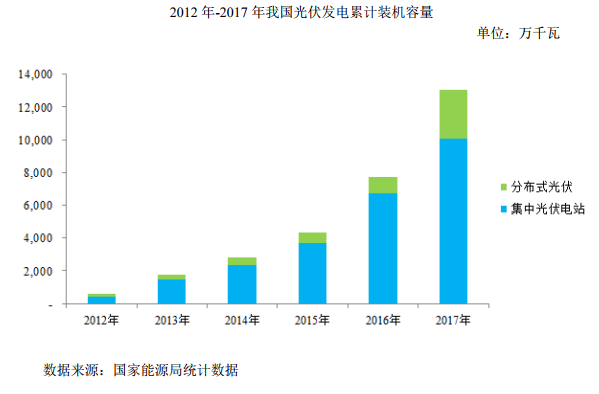 根据国家能源局的统计数据,截至2017年底,我国光伏电站累计装机容量13,025万千瓦,为全球光伏发电装机容量最大的国家。其中,集中式光伏电站10,059万千瓦,分布式光伏电站2,966万千瓦;2017年新增装机容量5,306万千瓦,其中集中式光伏电站新增3,362万千瓦,分布式光伏电站新增1,944万千瓦,呈迅速发展的趋势。