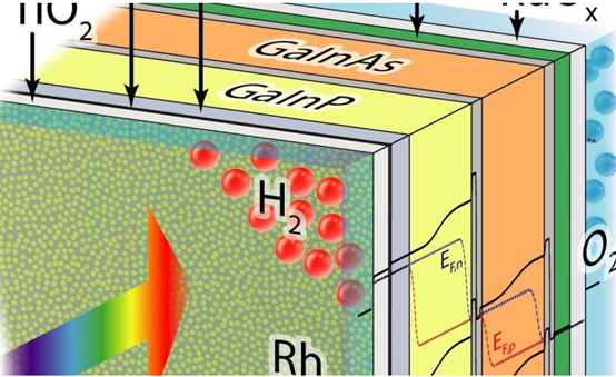 对于正在这里研究的单片光电阴极,研究团队将附加功能层与Fraunhofer ISE开发的III-V族半导体制成的高效串联电池相结合。这使得它们能够降低电池的表面反射率,从而避免由光反射引起的能量损失。美国加州理工学院的Hans Joachim Lewerenz教授解释说:“这也是我们工作的创新所在”,因为在2015年,我们已经在早期的电池中获得了超过14%的转化效率,这是当时的世界记录。在这里,我们用一层结晶二氧化钛层代替了防腐顶层,这种二氧化钛层不仅具有优异的抗反射性能,而且催化剂颗粒也附着在这种材料上面。加州理工学院的教授Harry Atwater补充说:此外,我们还使用了一种新的电化学方法产生铑纳米颗粒,这种颗粒用于催化水裂解反应。这些粒子直径只有十纳米,因此在光学上来说几乎是透明的,这使得它们非常适合这项工作。