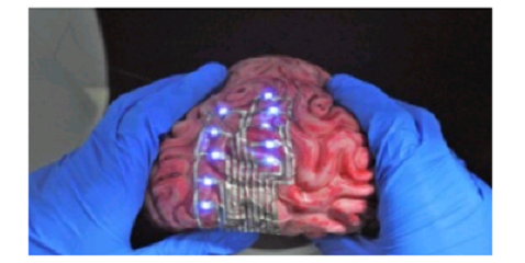 这些可拉伸、便宜、纹身般的电路可以贴合合并保持在高度弯曲的3D表面如人脑模型上。 图片来源:卡内基梅隆大学工程学院