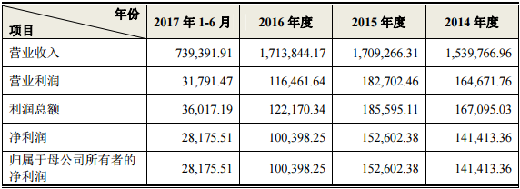 鹏鼎控股招股说明书显示,公司2014年,2015年,2016年,2017年1-6月分别实现营业收入153.98亿元、170.93亿元、171.38亿元、73.94亿元;实现归属母公司所有者的净利润为14.14亿元、15.26亿元、10.04亿元、2.82亿元,具体如下: