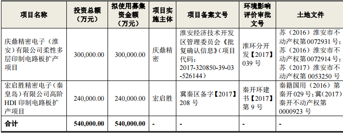 鹏鼎控股披露,此次募资公司将主要投资于“庆鼎精密电子(淮安)有限公司柔性多层印制电路板扩产项目”和“宏启胜精密电子(秦皇岛)有限公司高阶HDI印制电路板扩产项目”,本次募集资金项目合计投资总额共计54亿元,具体如下: