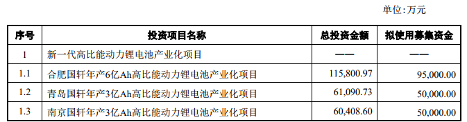 国轩高科表示,为提高募集资金的使用效率,满足公司经营发展及市场变化需要,公司拟将“合肥国轩年产6亿Ah高比能动力锂电池产业化项目”调整为“年产4Gwh高比能动力锂电池产业化项目”,实施主体由合肥国轩变更为国轩电池,实施地点由合肥市新站开发区变更为合肥经济技术开发区,项目总投资267,313.36万元,其中使用募集资金90,000万元,其余资金由公司自筹解决;拟将“青岛国轩年产3亿Ah高比能动力锂电池产业化项目”调整为“青岛国轩年产2Gwh高比能动力锂电池项目”,产品类型由三元电池调整为磷酸铁锂电池,项目总投资103,561万元,其中使用募集资金50,000万元,其余资金由公司自筹解决。