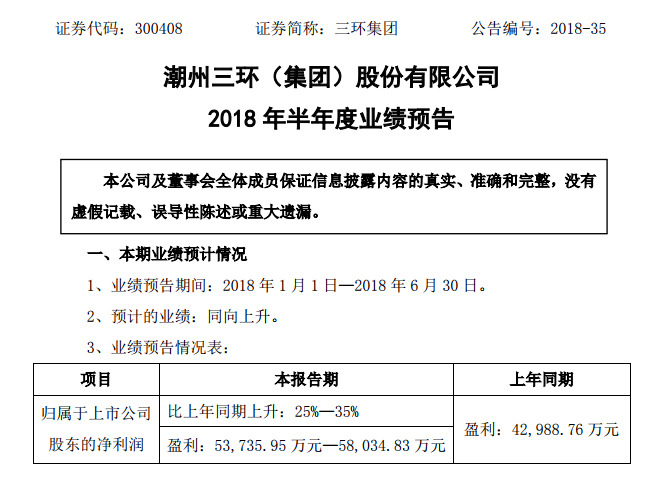 7月12日,三环集团(300408.SZ)发布2018年半年度业绩预告,显示公司预计上半年实现归属于上市公司股东的净利润53,735.95万元—58,034.83万元,比上年同期上升25%—35%。