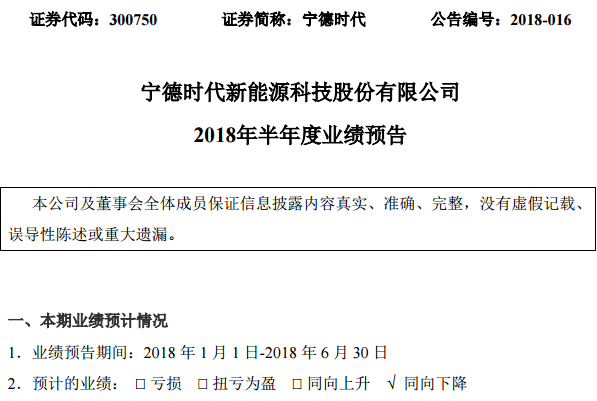 7月12日,宁德时代(300750.SZ)发布《2018年半年度业绩预告》,显示公司预计上半年实现归属于上市公司股东净利润88376.16万元—93842.72万元,比上年同期下降51.20%—48.19%。