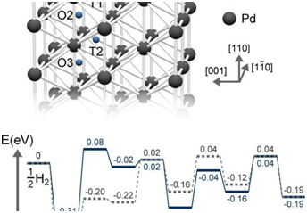 这种扩散作用类似于典型的化学反应,其速率由能垒决定,即H原子必须克服才能穿过钯原子。势垒高度是化学吸附H原子的能量与它们必须通过以到达第一个亚表面位置的过渡态之间的间隙。