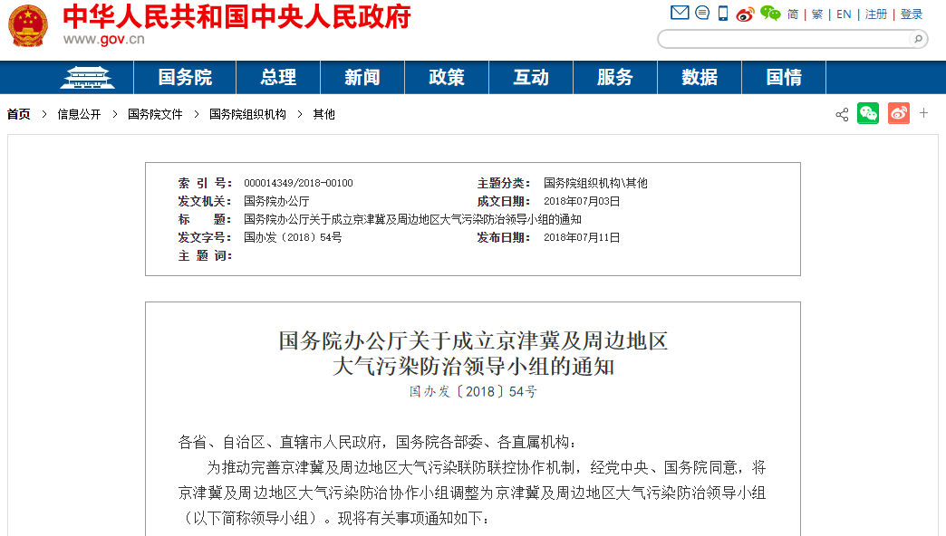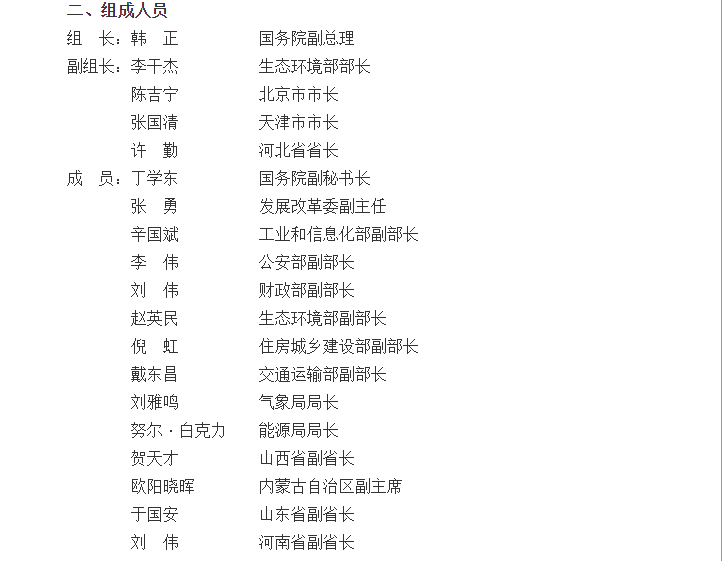 近日,国务院发布《关于成立京津冀及周边地区大气污染防治领导小组的通知》(以下简称《通知》),《通知》显示将京津冀及周边地区大气污染防治协作小组调整为京津冀及周边地区大气污染防治领导小组,由国务院副总理韩正担任组长,生态环境部部长李干杰、北京市市长陈吉宁、天津市市长张国清、河北省省长许勤等担任副组长。