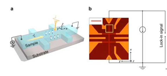 自旋相关光电压产生和实验装置的原理图。图a是沿x方向施加偏置电流Jc的器件结构示意图。 激光聚焦在具有垂直入射的装置上;图b具有电气连接表示的设备的光学图像,比例尺为50μm。扫描区域用黄色框表示,通过锁定放大器获得感应的光电压。