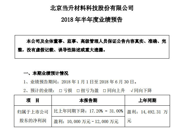 7月12日,当升科技发布2018年半年度业绩预告,显示公司预计上半年实现归属于上市公司股东的净利润10,000万元–12,000万元,比上年同期下降17.20%-31.00%。