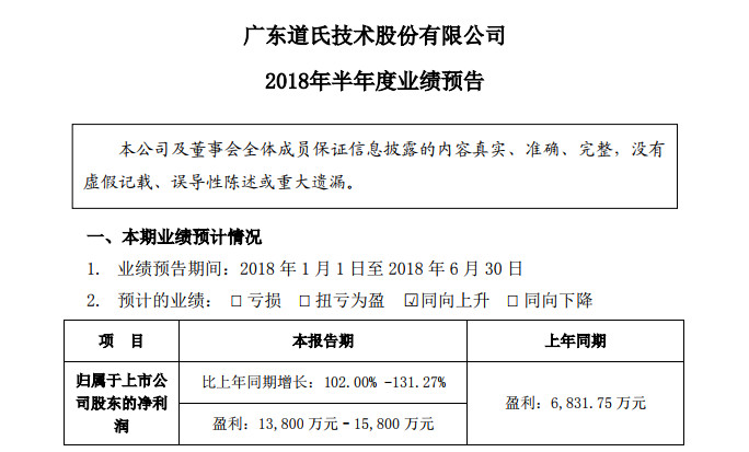 7月6日,道氏技术发布2018年半年度业绩预告,显示公司预计上半年实现归属于上市公司股东的净利润13,800万元–15,800万元,比上年同期增长102.00%-131.27%。