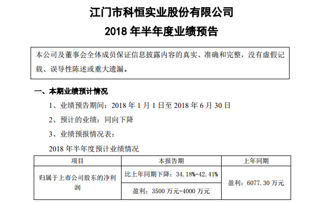 7月13日,科恒股份发布2018年半年度业绩预告,显示公司预计上半年实现归属于上市公司股东的净利润3500万元-4000万元,比上年同期下降34.18%-42.41%。