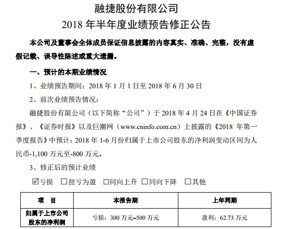 7月13日,融捷股份发布2018年半年度业绩预告修正公告,显示公司预计上半年亏损300万元-500万元。
