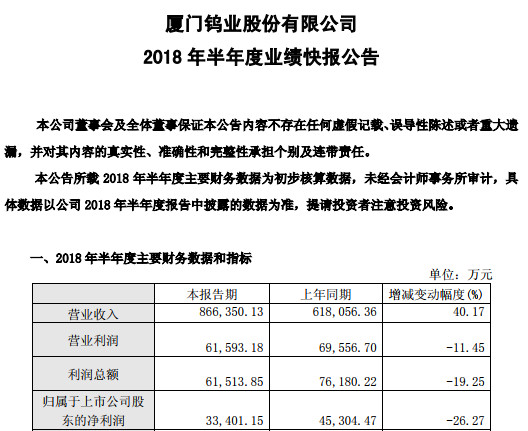 7月16日,厦门钨业发布2018年半年度业绩快报公告,显示上半年公司实现营业收入866,350.13万元,同比增长40.17%;实现归属于上市公司股东的净利润33,401.15万元,同比下降26.27%。
