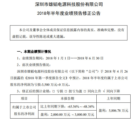 7月5日,雄韬股份发布2018年半年度业绩预告修正公告,显示预计上半年公司实现归属于上市公司股东的净利润2,000.00万元-3,000.00万元,比上年同期下降65.56%-48.34%。