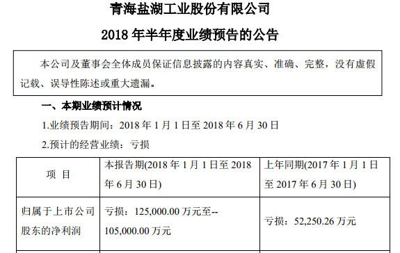 7月13日,盐湖股份发布2018年半年度业绩预告,预计上半年公司净利润亏损105,000.00万元--125,000.00万元。