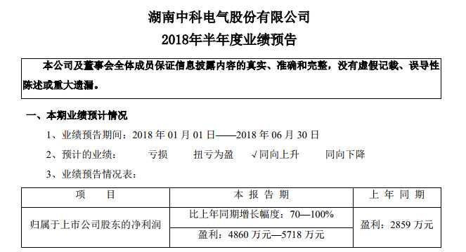 7月13日,中科电气发布2018年半年度业绩预告,显示公司预计上半年实现归属于上市公司股东的净利润4860万元—5718万元,比上年同期增长70%—100%。