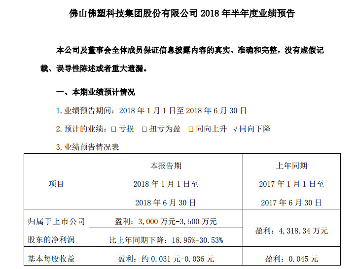 7月13日,佛塑科技发布2018年半年度业绩预告,显示公司预计上半年实现归属于上市公司股东的净利润3,000万元-3,500万元,比上年同期下降18.95%-30.53%。