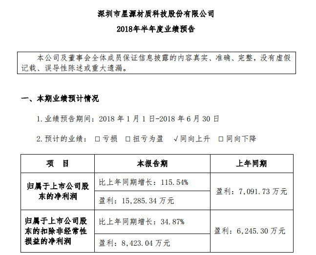 7月13日,星源材质发布2018年半年度业绩预告,显示公司预计实现归属于上市公司股东的净利润15,285.34万元,比上年同期增长115.54%。