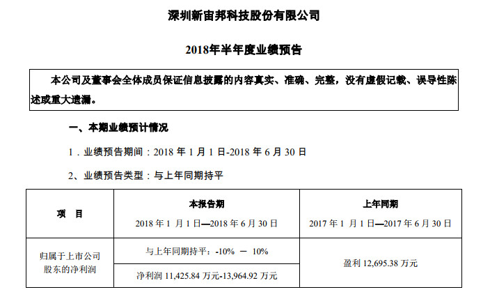 7月12日,新宙邦发布2018年半年度业绩预告,显示公司预计上半年实现归属于上市公司股东的净利润11,425.84万元-13,964.92万元,较上年同期变动-10%-10%。