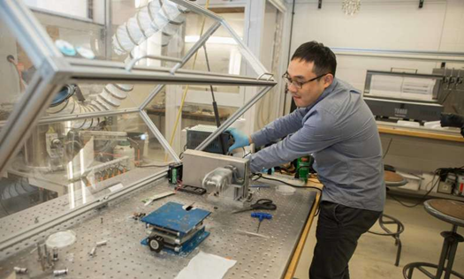 加州大学工程系学生Yanbo Fang在纳米实验室使用定制纺纱机将碳纳米管纤维卷成细线。图片来源:Joseph Fuqua II / UC Creative Services