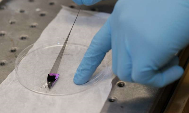加州大学的研究人员在实验室的工业线轴上拉伸了小纤维方块。 突然间,这块微小的碳片成为了一种类似蜘蛛丝的纺线,可以编织成纺织品。