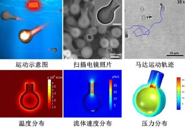 纳米马达是指能够将周围环境中的化学能或其他形式的能量转化为自身机械运动的纳米系统,亦称纳米机器。因纳米马达具有尺寸小、自主运动及药物装载能力强等突出优点,有望进入人体在血液中自由穿行,在生物医学领域特别是药物靶向运输、血栓快速清除、肿瘤精确治疗等方面具有巨大的应用前景。经过近十余年的探索,科学家们提出一系列通过化学燃料实现自驱动运动的人造纳米马达。然而,如何克服化学燃料对生命体的毒副作用是纳米马达应用中面临的巨大挑战。针对这一难题,贺强教授研究团队运用水热碳化的方法制备了花瓶状的炭基纳米马达。该纳米马达具有花瓶结构、均一的尺寸,而且在近红外区域有强的吸收。研究发现,在近红外光的照射下瓶状纳米马达依靠自身炭质外壳的光热效应产生的热量,迅速提升马达内部水温,导致腔内受热水体从瓶口处快速喷射而出,推动纳米马达向前运动,类似于飞机引擎的热喷气效应。这一发现与前期该团队基于自热泳机理的近红外光驱动阴阳纳米马达不同,揭示马达的自驱动机理与其自身的结构密切关联。此外,通过调节近红外光的输出功率可实现瓶状纳米马达运动的开关及运动速率的人为调控。该近红外光驱动瓶状纳米马达无需任何化学燃料,避免了化学燃料的毒副作用,为新一代人造纳米马达的设计和构造提供了新思路。(王雪/文)