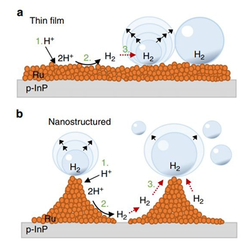 薄膜和纳米结构光电电极上气泡演化模型的横截面示意图。在薄膜电极表面的任意成核点处形成的H2 (a)导致气泡聚结并且形成气泡层,纳米结构Rh表面有利于诱导尖端形成H2气泡催化热点(b)。在这里沿着表面浓度梯度促进H2在形成时转移气泡。热点之间的距离阻止了形成的气泡的聚集。来源:自然通讯(2018)。