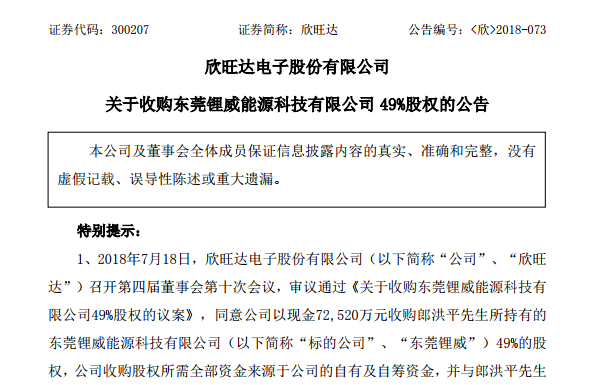 7月18日,欣旺达(300207.SZ)发布公告表示,公司将以现金72,520万元收购东莞锂威49%的股权,本次收购完成后,欣旺达将合计持有东莞锂威100%的股权,东莞锂威将成为欣旺达的全资子公司。