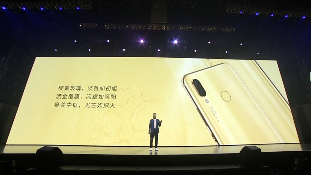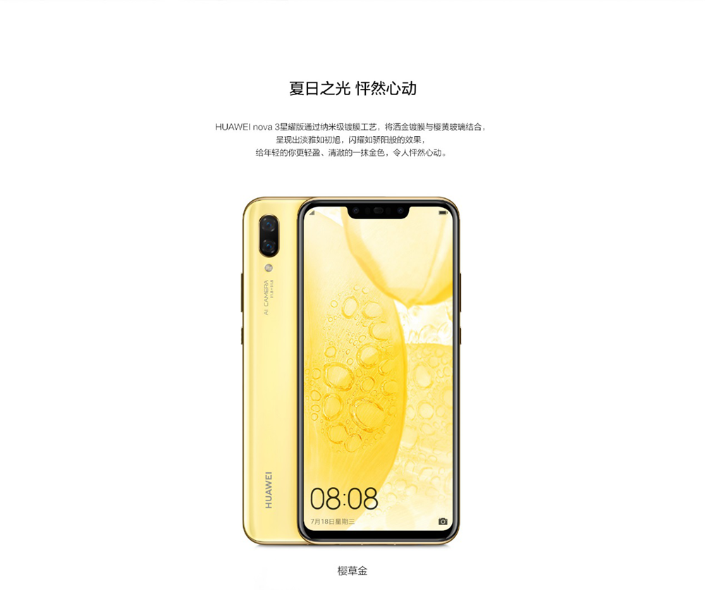 发布会引入星耀版系列:每一代nova系列都会有一个年度潮流色。此次nova3星耀版为2018潮流颜色樱草金。