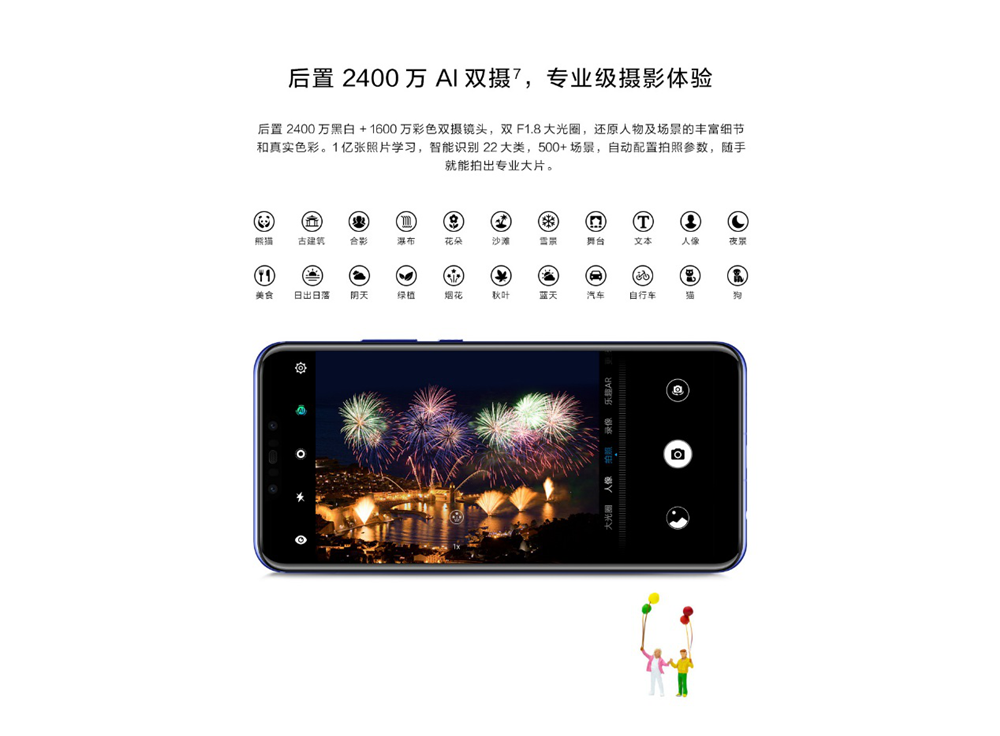 四种配色供用户选择。除却95度黑的亮黑色、nova2s曾出的浅艾蓝,还配有灵感来自于蓝花楹,呈现出一蓝一紫色彩的蓝楹紫,2018潮流颜色的樱草金。