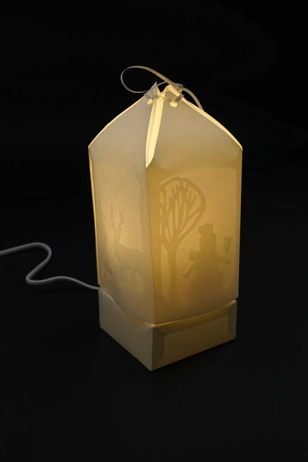 产品运用了YUPO纸良好的透光性、散光性、便于折叠、有一定承重度的特点,制作了灯座、灯罩和相关配件。通过不同厚度的YUPO纸,经过切割做成关灯时纯白简洁、亮灯时有趣的一盏可旋转灯具。