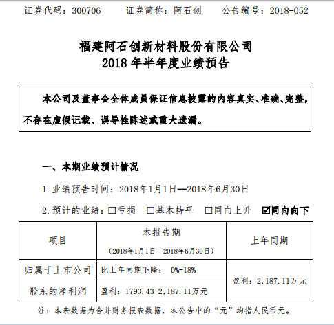 7月14日,阿石创发布《2018年半年度业绩预告》,显示预计上半年,公司实现归属于上市公司股东的净利润为1793.43—2187.11万元,与上年同期相比有所下降,下降幅度为0%—18%。