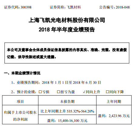 7月12日,飞凯光电发布《2018年半年度业绩预告》,显示预计上半年,公司实现归属于上市公司股东的净利润为15400—16100万元,比上年同期上升535.32%—564.20%。