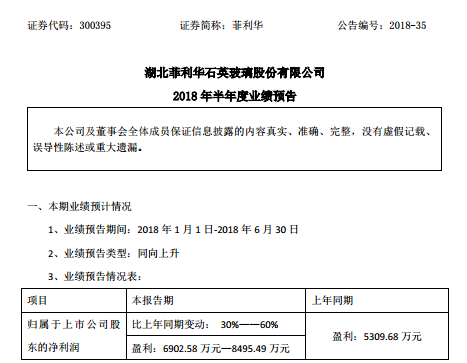 7月13日,菲利华发布《2018年半年度业绩预告》,显示预计上半年,公司实现归属于上市公司股东的净利润为:6902.58万元—8495.49万元。比上年同期变动30%—60%。